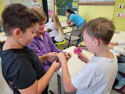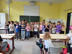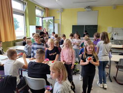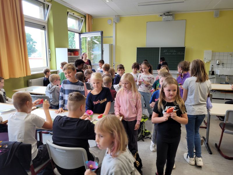 Auch die Erstklässler verabschiedeten sich von ihren Viertklässlerpaten. An der Henri-Arnaud-Grundschule ist es nämlich üblich, dass bereits bei der Einschulungsfeier jedem Schulanfänger ein Pate aus der vierten Klasse zugeteilt wird. Die Paten unterstützen beim Tragen der Schultüte, beim ersten Weg in die Sporthalle und bei vielen Fragen, die die Erstklässler haben. Auch einige Aktionen wie Basteln, Backen, Lesen oder die Einführung der Tablets wurden gemeinsam durchgeführt. Dafür wollten sich die Schülerinnen und Schüler der beiden ersten Klassen bedanken und bastelten mit Feuereifer Lolliblumen und Becherfangspiele, die sie den scheidenden Viertklässlern überreichten.