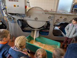 Zunächst füllten sie große Säcke mit Äpfeln in eine riesige Maschine. Das Ergebnis war beeindruckend: In einer großen Kiste sammelte sich der frisch gepresste Apfelsaft, während in einer anderen Kiste der Apfeltrester landete. Interessanterweise bildete sich in der Apfelsaftkiste eine erhebliche Menge Schaum, den die Kinder auch probieren durften. Der Geschmack war einzigartig - süß, aber auch leicht bitter.