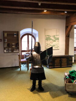 Zum Beispiel durften wir verschiedene Kleidung aus dem Mittelalter anziehen. Wir probierten sogar ein Kettenhemd, einen Ritterhelm und einen Eisenhandschuh an. Jeder durfte ein echtes Schwert tragen. Das war echt schwer!