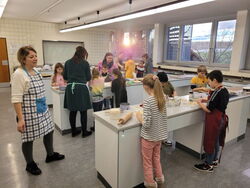 Adventliches Singen am Montagmorgen, liebevoll gestaltete Klassenzimmer, Adventskalender und -geschichten – in großen Schritten geht es auf Weihnachten zu. Auch das Backen gehört zu den schönen Traditionen in der Vorweihnachtszeit. So traf sich die Klasse 4c der Gustav-Heinemann-Schule mit der 2a der Henri-Arnaud-Grundschule zu einem gemeinsamen Vormittag. Nach dem Händewaschen ging es an die Arbeitsflächen, da wurde geknetet und ausgestochen. 5 Mütter unterstützten die Kinder und so waren im Handumdrehen viele Bleche voll mit leckeren Plätzchen. Ein Blech nach dem anderen wanderte in den Ofen und verbreitete weihnachtliche Gerüche im ganzen Schulhaus. Im Nachbarzimmer bastelte die zweite Gruppe Rentiere. Die Hände als Vorlage für das Geweih und die rote Nase – hübsche Fensterbilder zieren jetzt die Klassenzimmer. Einige ganz schnelle Kinder durften noch Kerzen gestalten. Beim gemeinsamen Abschluss wurde gesungen und natürlich die köstlichen Plätzchen probiert. Ein ganz herzliches Dankeschön den helfenden Händen beim Backen, Basteln und Teig Vorbereiten, ohne Unterstützung der Eltern wäre diese gelungene Aktion nicht möglich gewesen.
