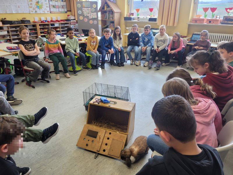 Die Klasse 2a behandelte im Sachunterricht das Thema Haustiere. Gekoppelt mit der Medienerziehung beschäftigten sich die Kinder in Kleingruppen mit jeweils einer Haustierart. Nachdem der Umgang mit dem „Bookcreator“ geübt war, erstellten alle mit diesem neuen Medium Präsentationen und berichteten mit dem Visualizer den anderen, was sie alles über „Ihr Tier“ erfahren hatten. Doch es sollte nicht bei der Erarbeitung am Computer bleiben. Als erstes brachten Klara und Leonie ihre Häschen mit in die Schule. Mit allen war vorher besprochen worden, dass Tiere sehr viel besser hören als Menschen. Und so war die Klasse mucksmäuschenstill. Als die Tiere sich wohl fühlten und munter im Klassenzimmer herumhoppelten, durften sie auch in Kleingruppen gestreichelt werden. Klara und Leonie berichteten, wie viel Arbeit Tiere machen und welche Aufgaben sie schon alleine mit ihren Tieren erledigen können. So wurde das Thema Haustiere auch ganz praktisch erfahren. Die Klasse 2a freut sich schon auf weitere Tierbesuche.