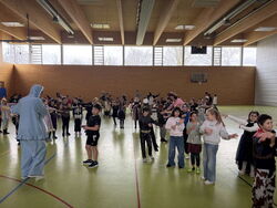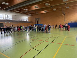 Der Höhepunkt des Tages fand für die Klassen 3a, 3b, 4a sowie alle Klassen der Gustav-Heinemann-Schule (1g bis 4g) in der letzten Stunde in der Sporthalle statt. Dort startete eine riesige Polonaise, die sich quer durch die gesamte Halle schlängelte. Mit schwungvollen Klassikern wurde gemeinsam gesungen, gelacht und getanzt. Die gute Laune war ansteckend, und selbst die Lehrkräfte reihten sich begeistert in die Polonaise ein.