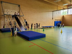 Fast jeden Tag trifft die Klasse 1a die Vorschulkinder im Gang oder auch auf dem roten Platz bei einer Bewegungspause. Da lag es nahe, auch einmal eine gemeinsame Sportstunde durchzuführen. Nach dem gemeinsamen Umziehen trafen sich alle bei einem Klatschrhythmus im Kreis. Die ErzieherInnen hatten sich ein sportliches Lied überlegt, um auf die Bewegung einzustimmen. Dann ging es an den Aufbau. Stolz bewiesen die Erstklässler, wie gut sie schon die Geräte transportieren und aufbauen können. Unter ihrer Anleitung packten die Vorschulkinder tatkräftig mit an und so entstand schnell ein abwechslungsreicher Bewegungsparcours zum Klettern, Rutschen, Krabbeln, Schaukeln und Balancieren. Wieder einmal zeigte die neue Sporthalle ihre Qualitäten, immerhin konnten sich über 40 Kinder so richtig austoben. Mit Begeisterung bewegten sich die Kinder, mit dem Zuspruch der Erstklässler gelang es auch fast jedem Vorschulkind die steile Rutsche herunter zu rutschen. Ganz selbstverständlich wurde die Hand gegeben und geholfen.