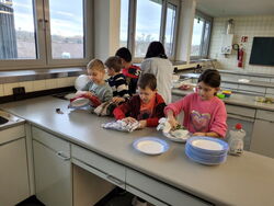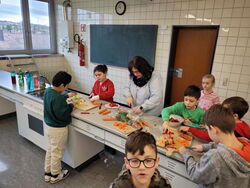 Zum Glück konnten alle Wünsche erfüllt werden. Mit Gurken, Karotten, Radieschen, Salat und Frischkäse zog die Klasse bepackt wieder zurück in die Schule. Daraufhin wurde geschält und geschnippelt. Am Büffet durfte sich dann jeder sein eigenes lustiges Brotgesicht herstellen. Mit viel Appetit wurde das gesunde Brot verzehrt – selbst gemacht schmeckt es doch einfach am besten. Zum Schluss halfen viele fleißige Hände beim Abwaschen und Abtrocknen.