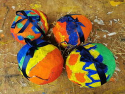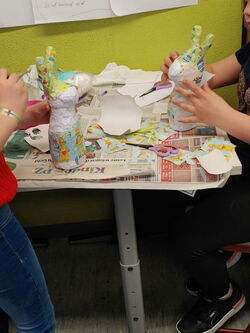 Die 1a hat auch gekleistert, allerdings entstanden hier Ostereier. Luftballons wurden mit Zeitungspapier und Kleister beklebt und später bunt angemalt. Im aufgeschnittenen Ei konnten die Kinder die gefundenen Ostereier verstauen.