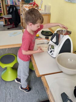Zum Schluss stellten wir noch unser eigenes Apfelmus her. Nachdem wir unseren Arbeitsplatz gesäubert und unsere Hände gewaschen hatten, legten wir ein Geschirrhandtuch und ein Schneidebrett auf den Tisch. Nun packten wir vorsichtig die scharfen Messer aus und dann konnte es losgehen. Die gewaschenen Äpfel wurden geteilt und in kleine Stücke geschnitten, Apfelblüten und Kerngehäuse haben wir entfernt. Das war gar nicht so einfach und 1-2 Pflaster waren notwendig.