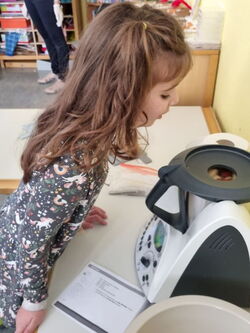 Anschließend wurden die kleinen Apfelstücke in den Thermomix gefüllt, dort gekocht und zu Brei zerkleinert. Es war interessant, dabei zuzuschauen und es duftete herrlich.