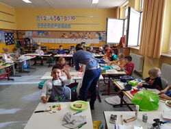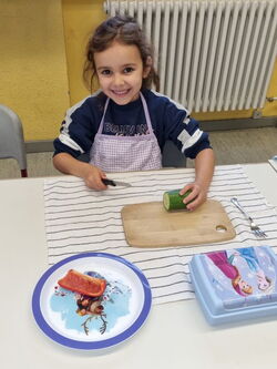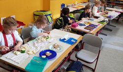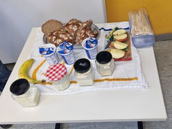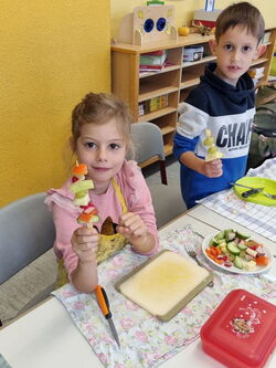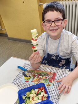 Frau Bauer brachte die Kinder zum Staunen, als sie ihnen mit Zuckerwürfeln zeigte, wie viel Zucker in Eistee, Schokomilch, Cola und Fanta steckt. Im Anschluss erklärte Frau Bauer den Kindern anhand der Ernährungspyramide, welche Lebensmittel unser Körper täglich braucht und welche man eher in Maßen genießen soll. Danach durften die Kinder ihr eigenes gesundes Pausenbrot zubereiten und sich einen leckeren Früchtespieß stecken. Das machte ihnen besonders viel Spaß und sie arbeiteten begeistert mit. Es war ein toller Vormittag, bei dem die Kinder mit Begeisterung und Freude gelernt haben, welche Lebensmittel ihnen und ihrem Körper guttun.