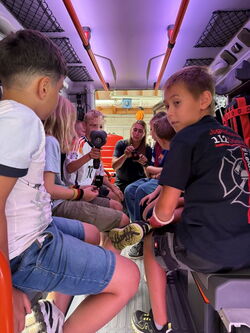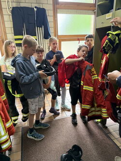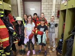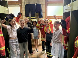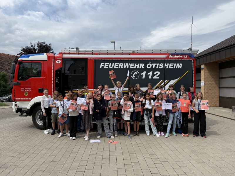 Die Klasse 4 war am Freitag, den 25.07.25 bei der Feuerwehr Ötisheim. Zuerst wurden wir in vier Gruppen eingeteilt. Abwechselnd durften wir an Stationen mit dem Hohlstrahlrohr Wasser wie beim Löschen eines Feuers spritzen. In einer weiteren Station lernten wir in der Fahrzeugkunde viele interessante Geräte der Ausrüstung eines Feuerwehrautos kennen. In das Auto durften wir auch hineinsitzen und durch ein Wärmebildgerät schauen. Bei der dritten Station durften wir eine kleine Runde mit dem Feuerwehrauto mitfahren. Die vierte Station fand in den Umkleideräumen der Feuerwehr statt. Dort konnten wir auch Feuerwehr-Einsatzkleidung anprobieren. Die Jacken waren sehr schwer. Wir hatten viel Spaß und es war ein schöner Tag bei der Feuerwehr Ötisheim. Zum Schluss haben wir noch ein Bild vor dem Feuerwehrauto gemacht.