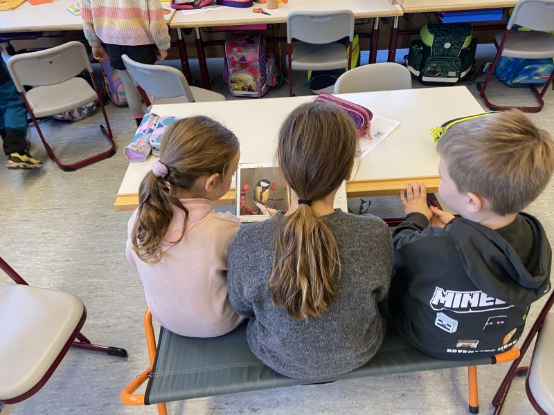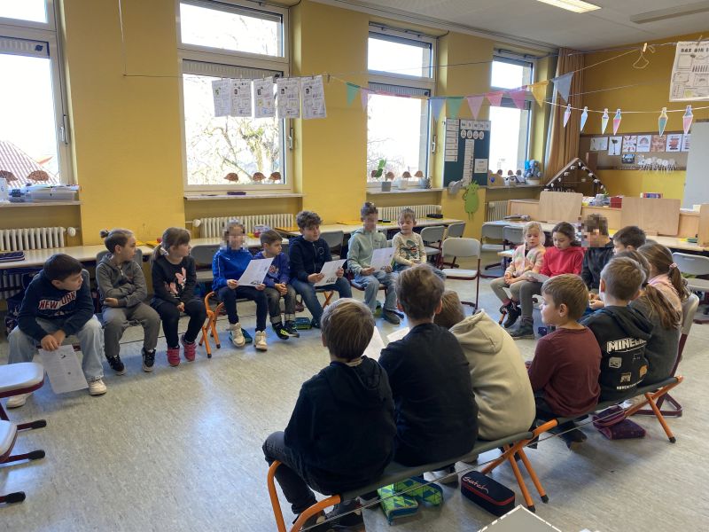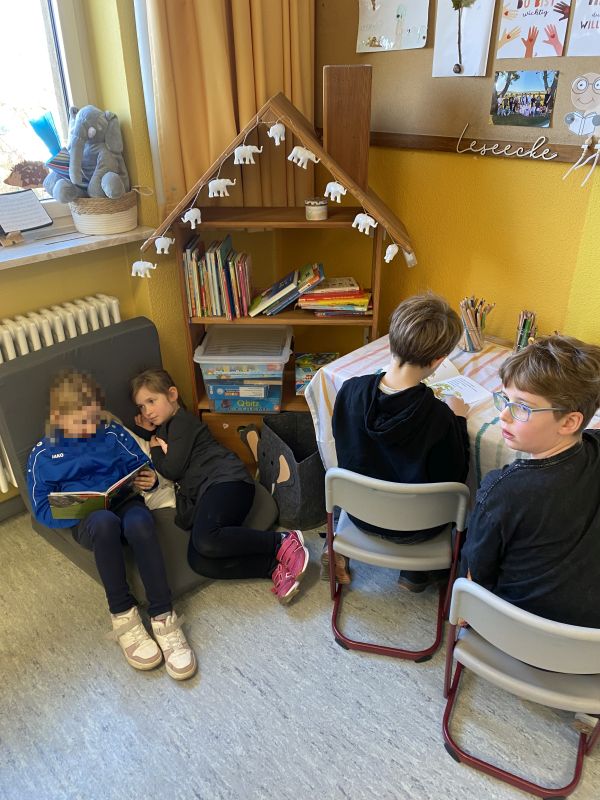 In den ersten und vierten Klassen wurde der Drache Kokosnuss gelesen. Die Viertklässler als Paten der Erstklässler unterstützten diese nicht nur beim Lesen sondern auch beim gemeinsamen Basteln. Zum Schluss durften sich die Patenkinder aus den ersten Klassen noch ein Wunschbuch aus dem Bücherhaus von den Viertklässlern vorlesen lassen.
