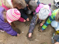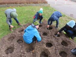Wir holten die Erde und Steine aus den Löchern. Danach setzten wir die Zwiebeln ein und bedeckten sie mit der ausgegrabenen Erde. Wir sind gespannt, welche Blumen im Frühling blühen!
