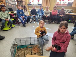 Die Klasse 2a behandelte im Sachunterricht das Thema Haustiere. Gekoppelt mit der Medienerziehung beschäftigten sich die Kinder in Kleingruppen mit jeweils einer Haustierart. Nachdem der Umgang mit dem „Bookcreator“ geübt war, erstellten alle mit diesem neuen Medium Präsentationen und berichteten mit dem Visualizer den anderen, was sie alles über „Ihr Tier“ erfahren hatten. Doch es sollte nicht bei der Erarbeitung am Computer bleiben. Als erstes brachten Klara und Leonie ihre Häschen mit in die Schule. Mit allen war vorher besprochen worden, dass Tiere sehr viel besser hören als Menschen. Und so war die Klasse mucksmäuschenstill. Als die Tiere sich wohl fühlten und munter im Klassenzimmer herumhoppelten, durften sie auch in Kleingruppen gestreichelt werden. Klara und Leonie berichteten, wie viel Arbeit Tiere machen und welche Aufgaben sie schon alleine mit ihren Tieren erledigen können. So wurde das Thema Haustiere auch ganz praktisch erfahren. Die Klasse 2a freut sich schon auf weitere Tierbesuche.