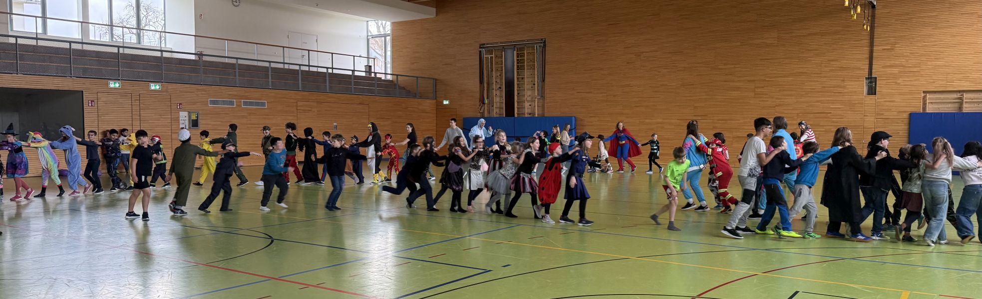 Der Höhepunkt des Tages fand für die Klassen 3a, 3b, 4a sowie alle Klassen der Gustav-Heinemann-Schule (1g bis 4g) in der letzten Stunde in der Sporthalle statt. Dort startete eine riesige Polonaise, die sich quer durch die gesamte Halle schlängelte. Mit schwungvollen Klassikern wurde gemeinsam gesungen, gelacht und getanzt. Die gute Laune war ansteckend, und selbst die Lehrkräfte reihten sich begeistert in die Polonaise ein.