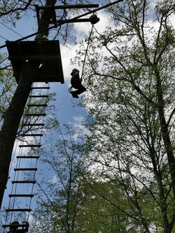 In kleinen Teams durften wir dann losziehen und klettern. Es gab mehrere Starterparcours mit nur einem Eichhörchen, das anzeigte, dass es ein einfacher Parcours war. Einen davon sollten wir zuerst klettern. Danach konnten wir auch die schweren mit zwei oder drei Eichhörnchen klettern. Es gab den Basejump bei dem man aus 12 Meter Höhe von einer Plattform herunterspringen kann. Einige von uns haben das auch gemacht. Es gab auch eine 500m lange Seilbahn über den Klostersee und einen Parcours den man zu zweit klettern konnte.