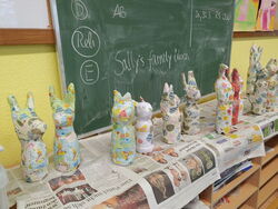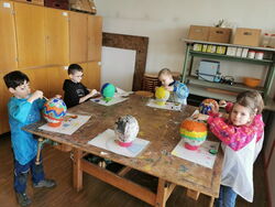 Die 1a hat auch gekleistert, allerdings entstanden hier Ostereier. Luftballons wurden mit Zeitungspapier und Kleister beklebt und später bunt angemalt. Im aufgeschnittenen Ei konnten die Kinder die gefundenen Ostereier verstauen.