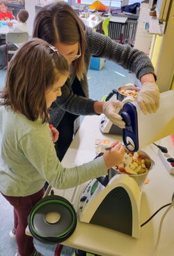 Zum Schluss stellten wir noch unser eigenes Apfelmus her. Nachdem wir unseren Arbeitsplatz gesäubert und unsere Hände gewaschen hatten, legten wir ein Geschirrhandtuch und ein Schneidebrett auf den Tisch. Nun packten wir vorsichtig die scharfen Messer aus und dann konnte es losgehen. Die gewaschenen Äpfel wurden geteilt und in kleine Stücke geschnitten, Apfelblüten und Kerngehäuse haben wir entfernt. Das war gar nicht so einfach und 1-2 Pflaster waren notwendig.
