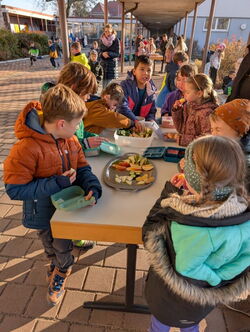 Während die Kinder den Fokus auf den bundesweiten Vorlesetag richteten, wurde in der Schulküche bereits fleißig geputzt und geschnitten. Insgesamt 35 Kilogramm Obst und Gemüse galt es in kindgerechte Stücke zu schneiden und anzurichten, damit die Obst- und Gemüsepause auch diesmal stattfinden konnte. Pünktlich um 9.20 Uhr war es soweit. Die Schülerinnen und Schüler der Henri-Arnaud-Grundschule und der Gustav-Heinemann-Schule stürmten die reichlich gedeckten Tische und freuten sich über die bunte Auswahl an saisonalem Obst und Gemüse.