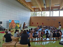 Am Donnerstag, 06.06.2024 wurden die Erst- und Zweitklässler der Henri-Arnaud-Grundschule und der Gustav-Heinemann-Schule von Frank Ströber dem Erzähler in der Sporthalle erwartet.