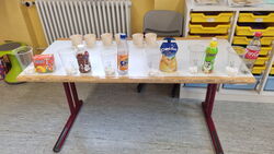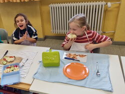 Frau Bauer brachte die Kinder zum Staunen, als sie ihnen mit Zuckerwürfeln zeigte, wie viel Zucker in Eistee, Schokomilch, Cola und Fanta steckt. Im Anschluss erklärte Frau Bauer den Kindern anhand der Ernährungspyramide, welche Lebensmittel unser Körper täglich braucht und welche man eher in Maßen genießen soll. Danach durften die Kinder ihr eigenes gesundes Pausenbrot zubereiten und sich einen leckeren Früchtespieß stecken. Das machte ihnen besonders viel Spaß und sie arbeiteten begeistert mit. Es war ein toller Vormittag, bei dem die Kinder mit Begeisterung und Freude gelernt haben, welche Lebensmittel ihnen und ihrem Körper guttun.